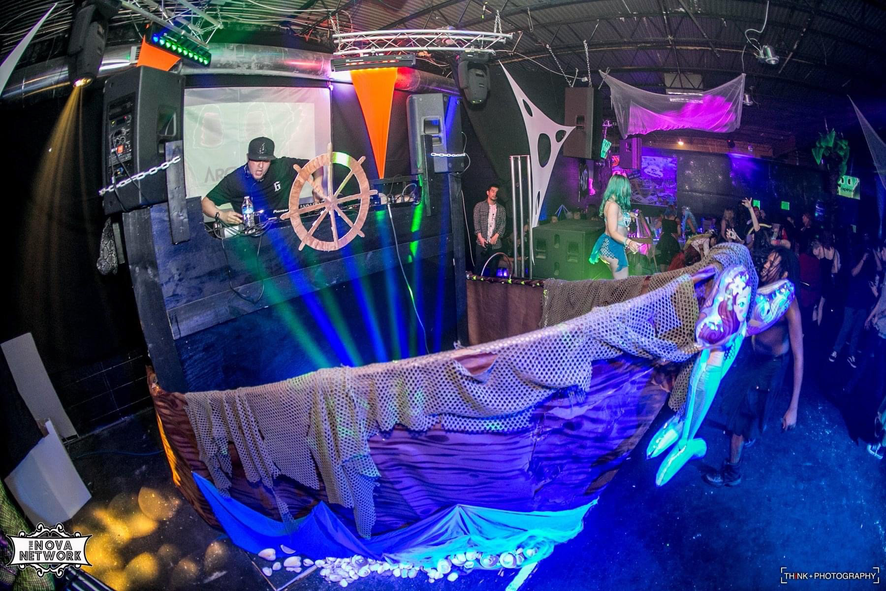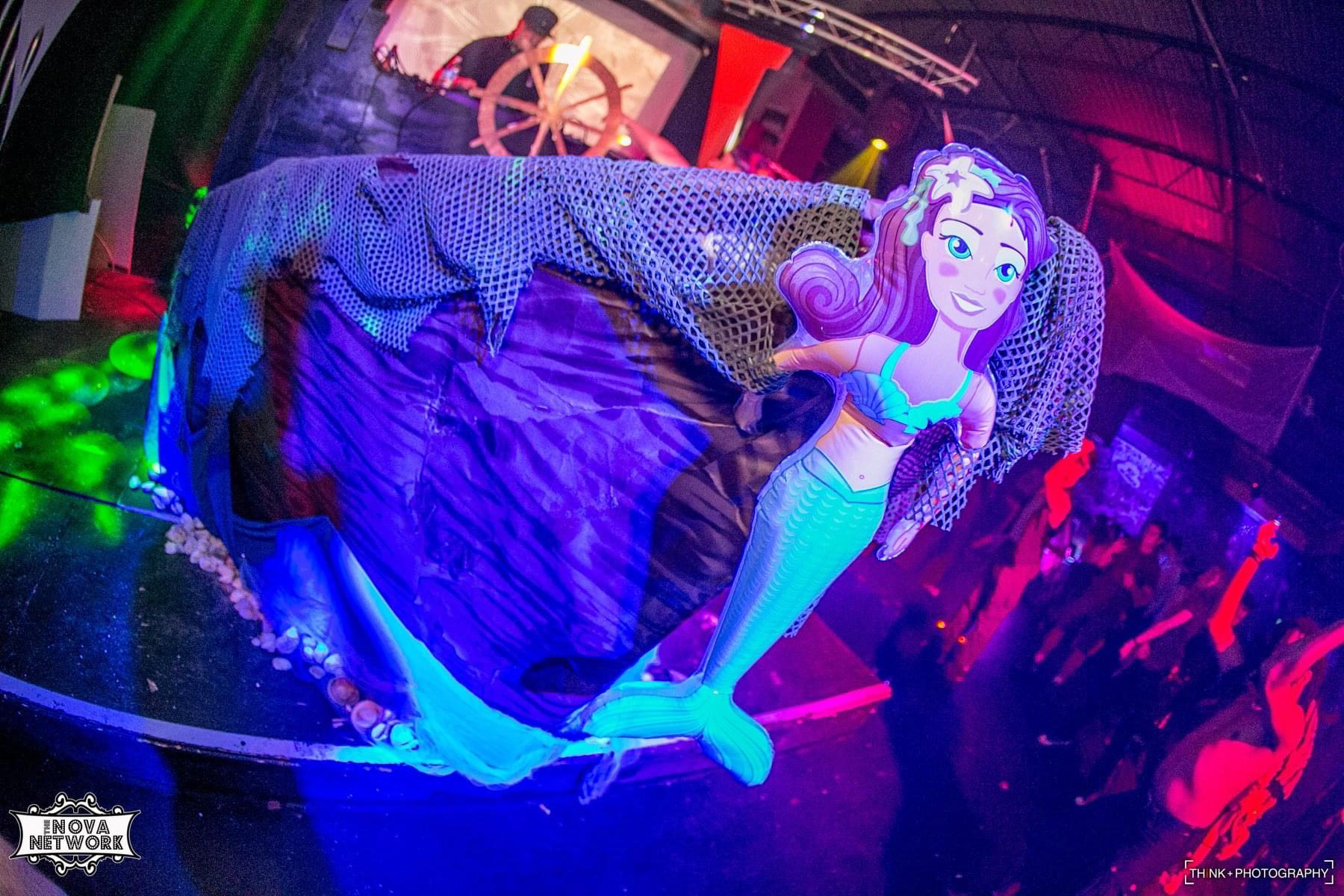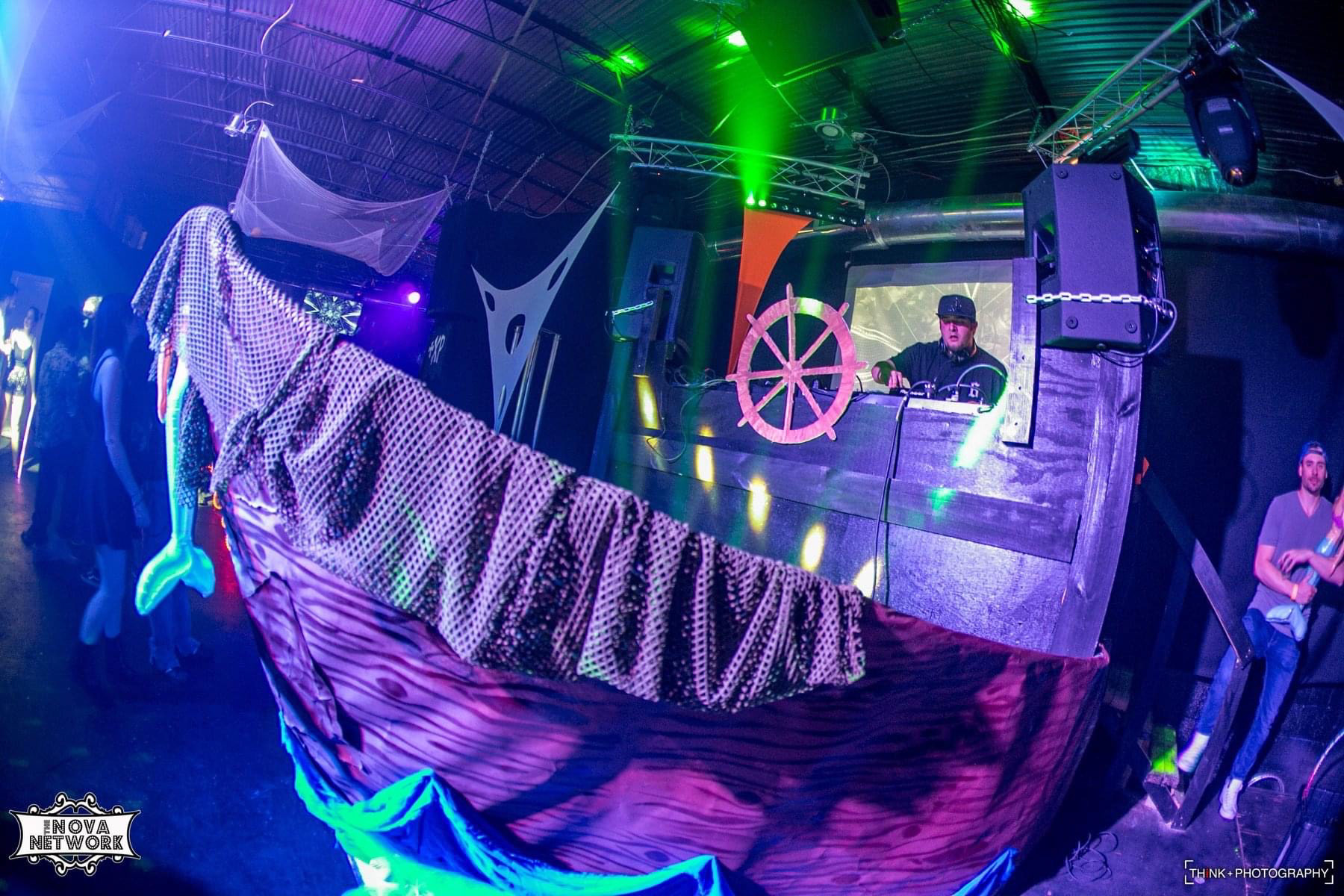 These pictures are from a stage that I helped to design and build along with my boss and two volunteers. The ship is made of PVC pipe for the structural base and butcher paper that we painted to look like wood for the exterior. There is a large fishing net placed over the front of the ship to hide the top of the butcher paper and give the illusion of a real ship and the water at the bottom was created with spandex fabric and real shells. We also added a wheel to the front of the DJ booth as they would be the captain of the musical adventure. This wheel is made out of foam board and paint.